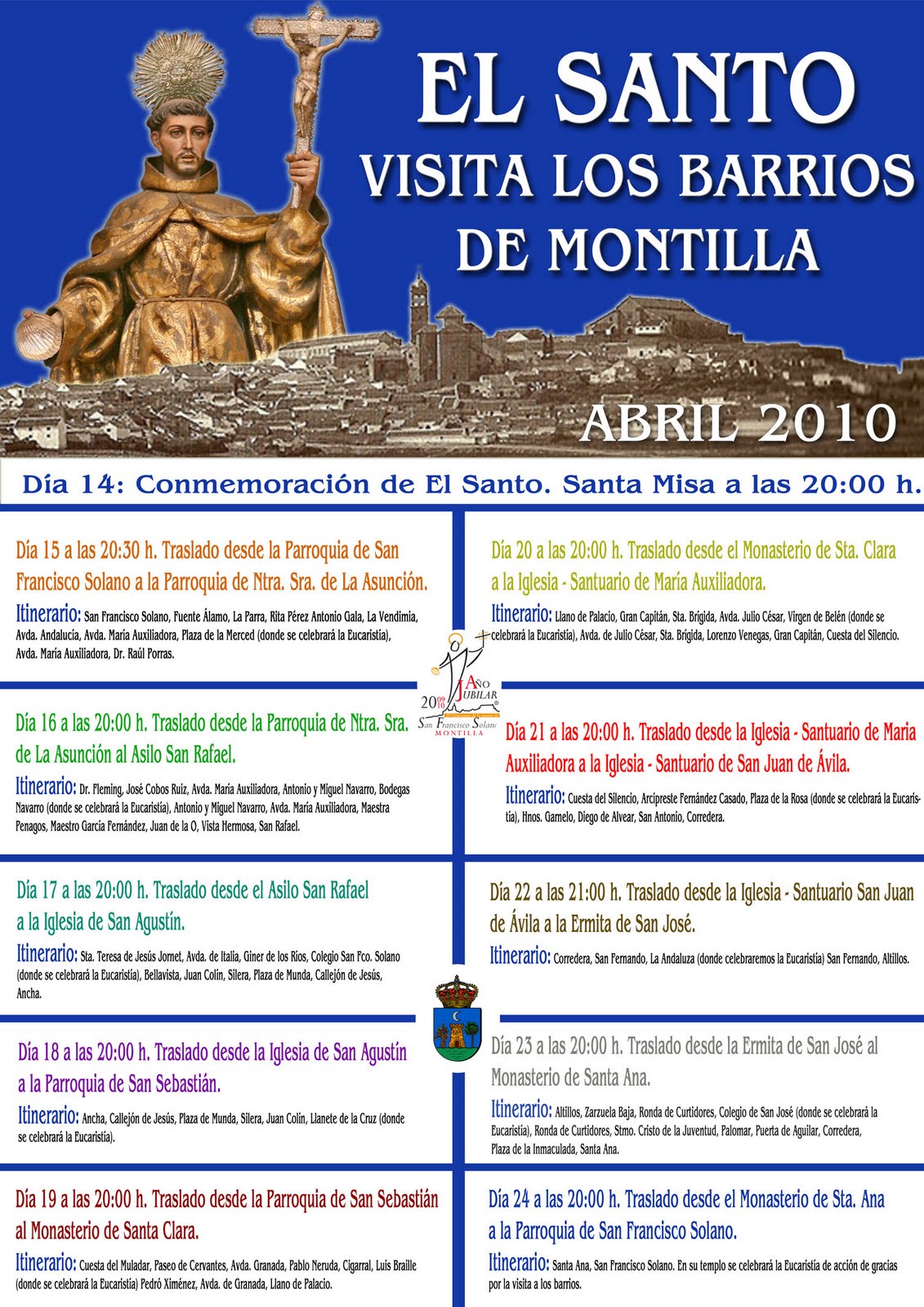 Con motivo del Año Jubilar, concedido a Montilla por el Santo Padre Benedicto XVI, para conmemorar el IV Centenario de la Muerte de San Francisco Solano, se va a realizar en los próximos días del 15 al 23 de abril, una novena itinerante con la imagen del Santo, que se venera en su casa natal.